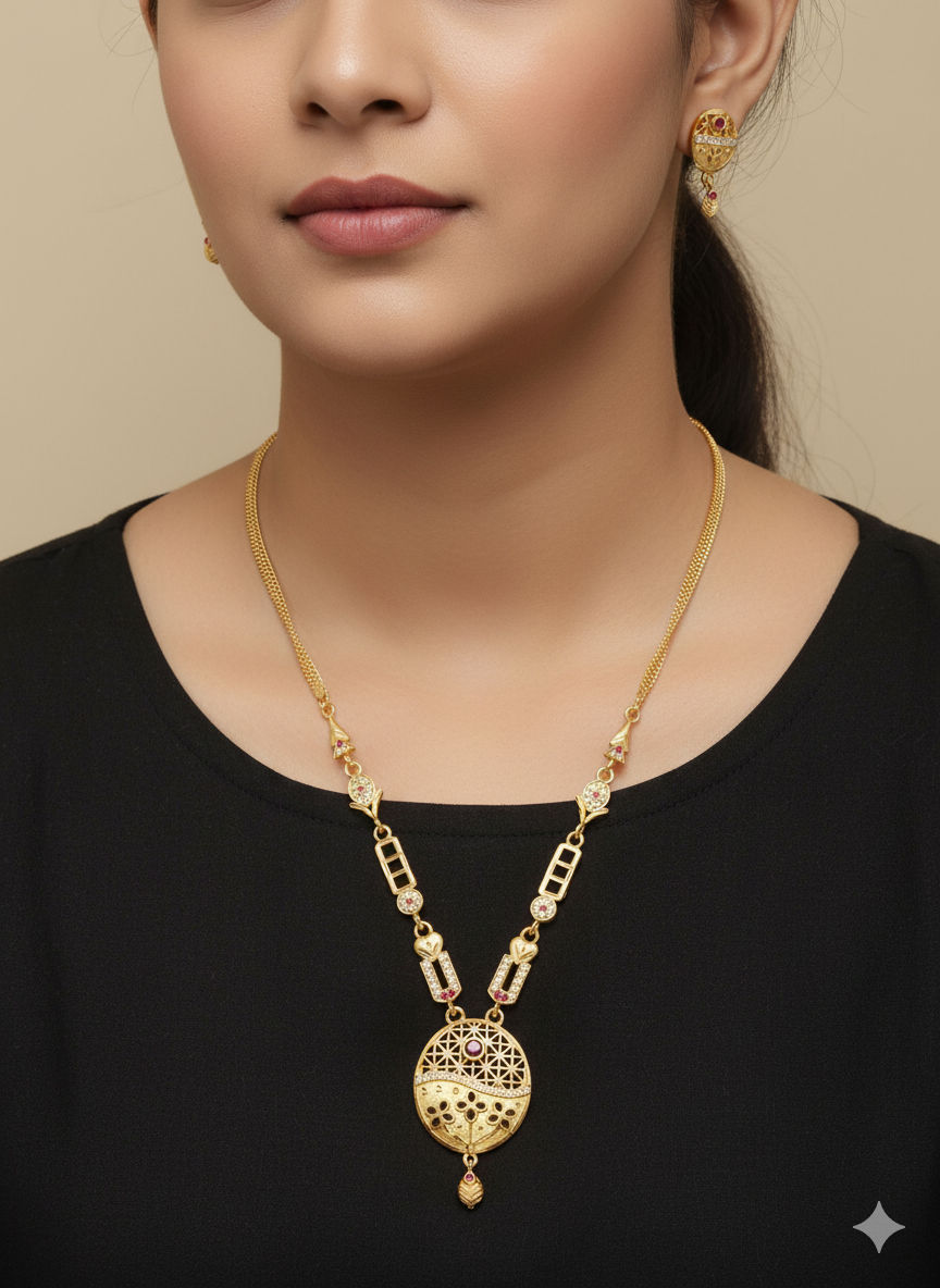 Micro Gold Plated AD Diamond Studded Flower Oval Necklace with Earrings for Women